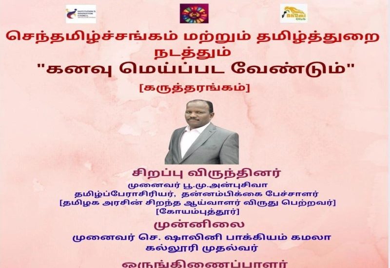 சூலூர் மைக்கேல் ஜோப் மகளிர் கலை மற்றும் அறிவியல் கல்லூரி தமிழ்த்துறையின் செந்தமிழ்ச் சங்கம் சார்பாக "*கனவு மெய்ப்பட வேண்டும்*" என்னும் தலைப்பில் கருத்தரங்கமானதுநடைபெற்றது.அதில்👩🎓 *சிறப்பு* *விருந்தினராக**முனைவர்.பூ.மு.*